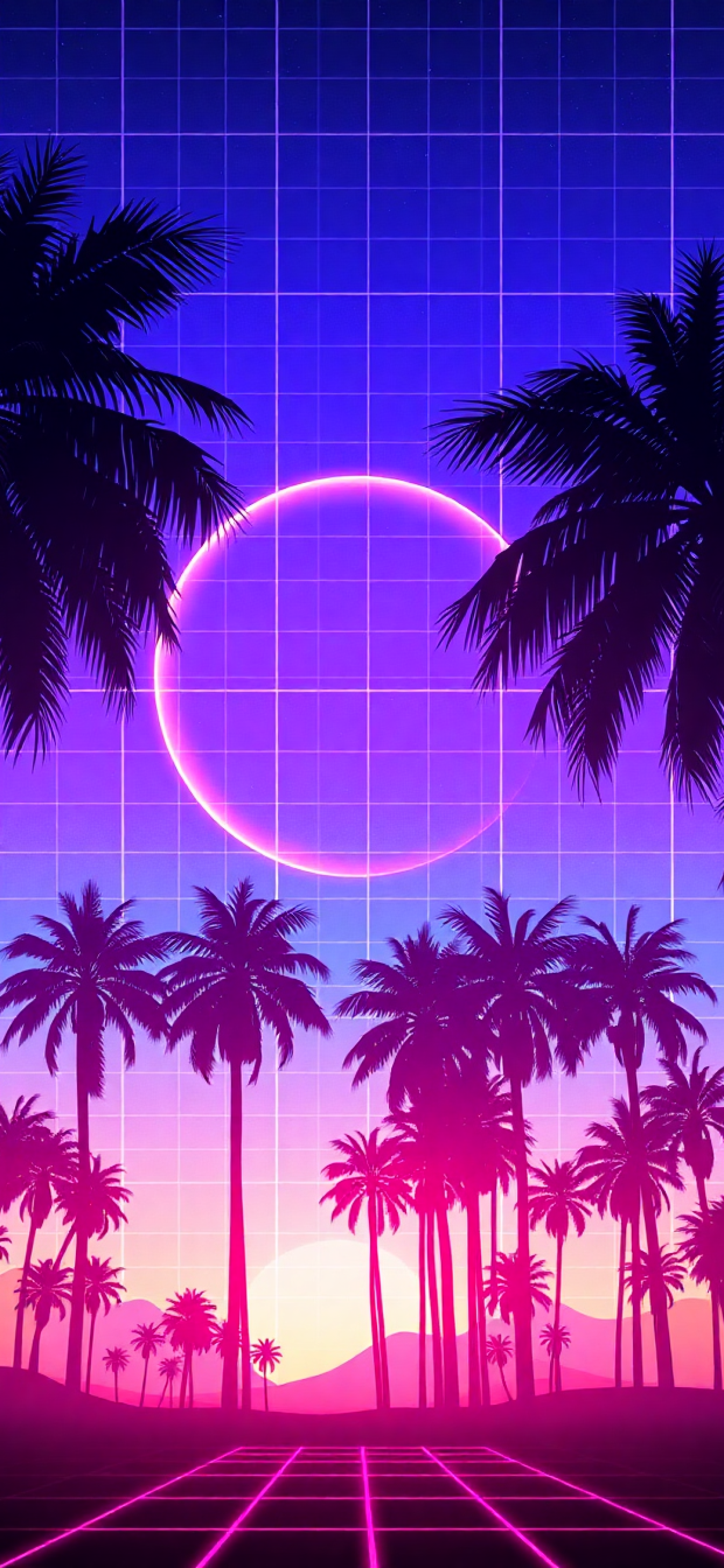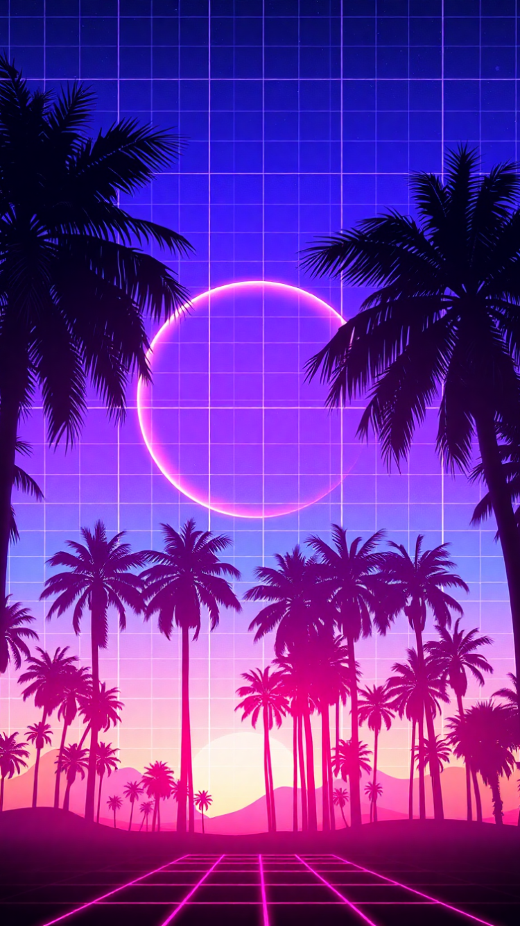 80s synthwave grid sunset palm trees neon