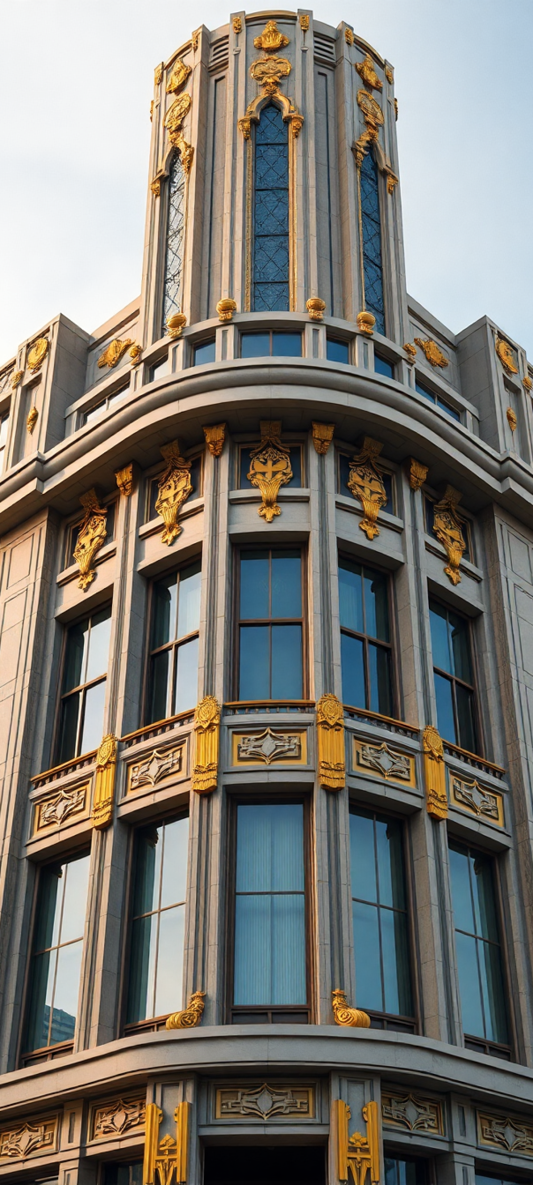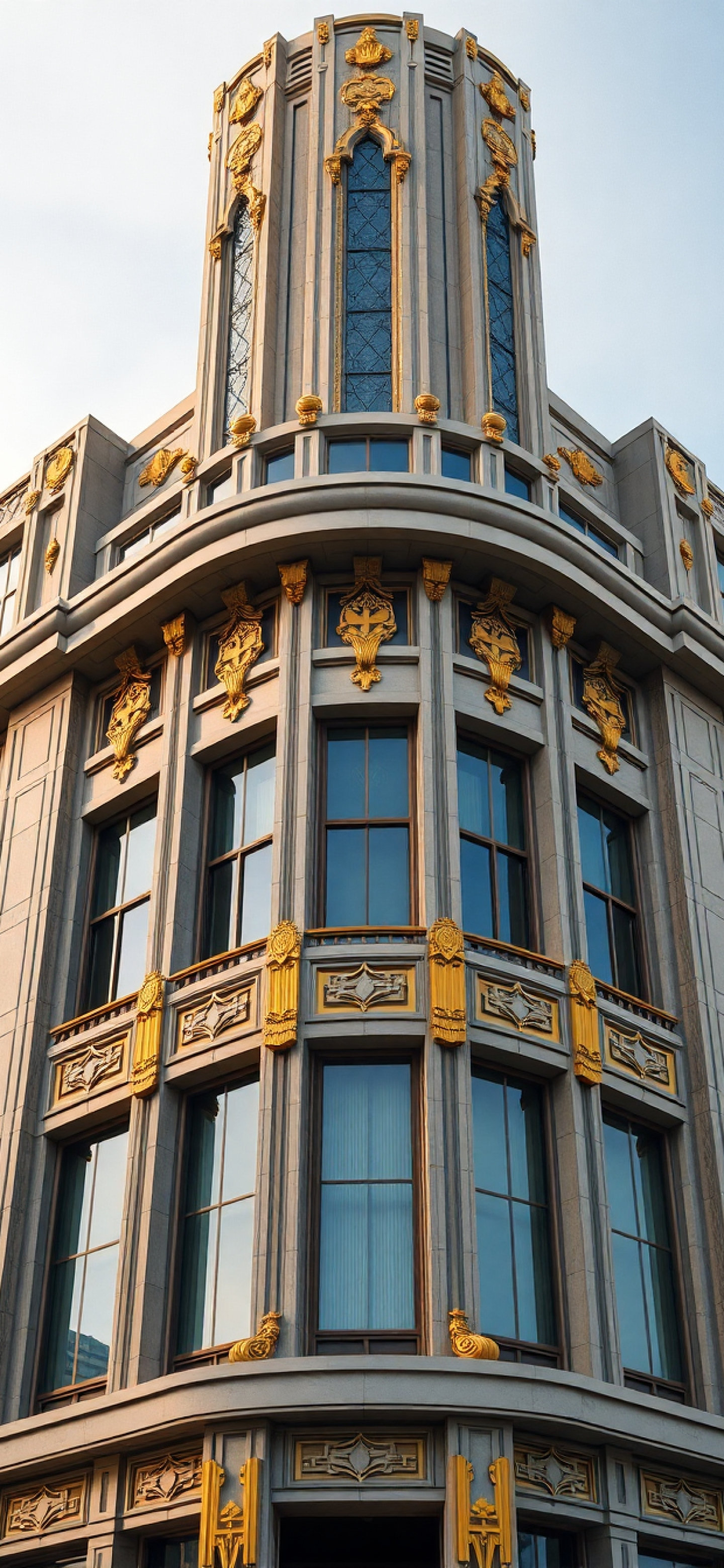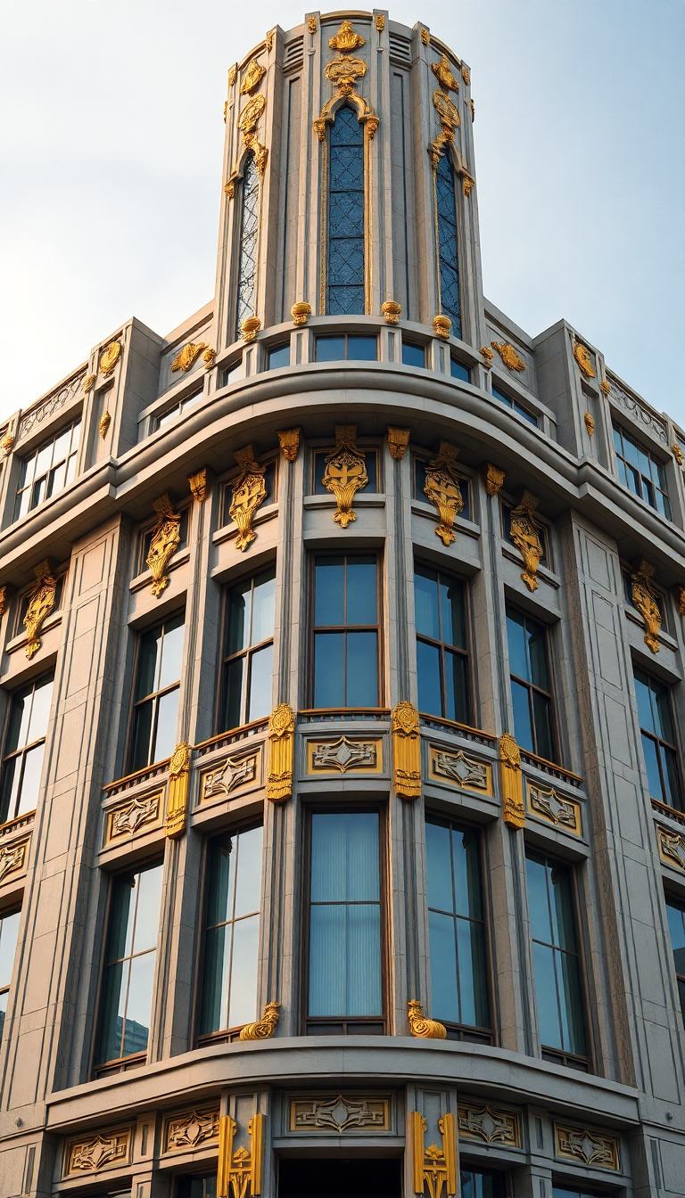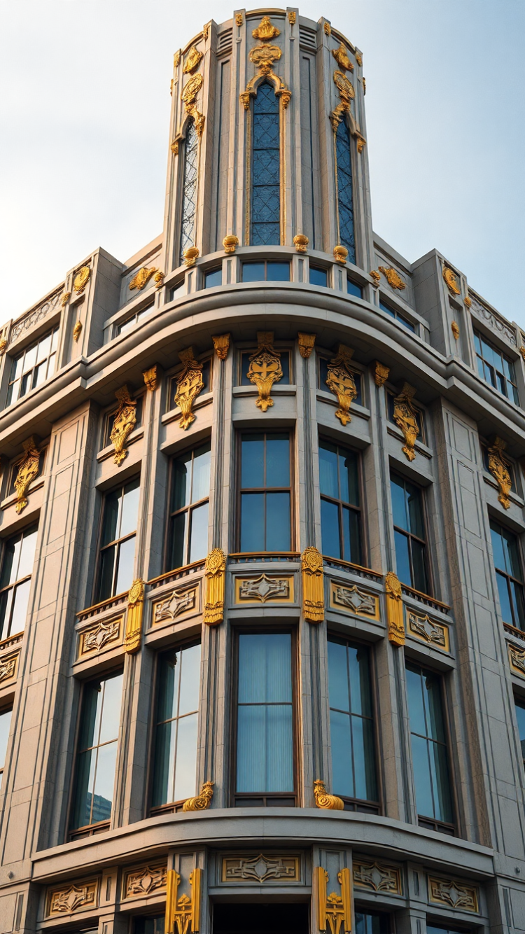 art deco building facade geometric golden details
