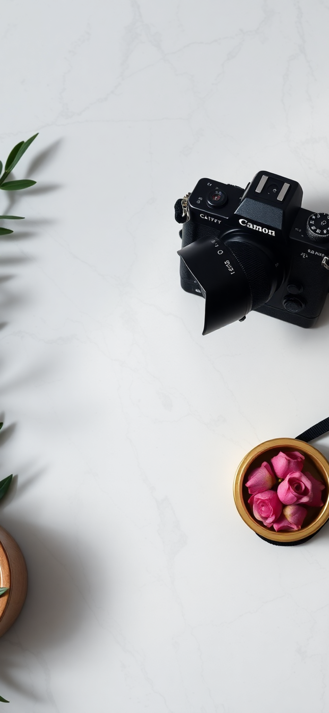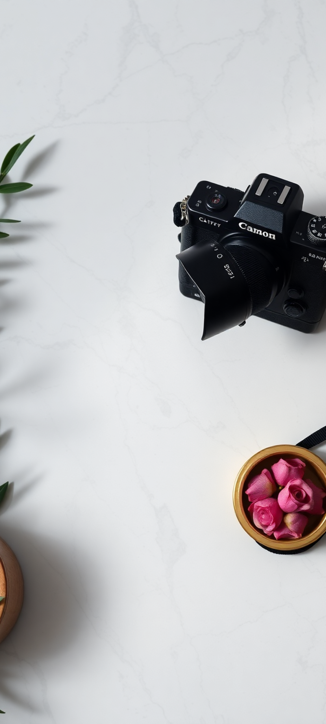 Film Camera On Marble Flatlay Photorealistic Wallpaper