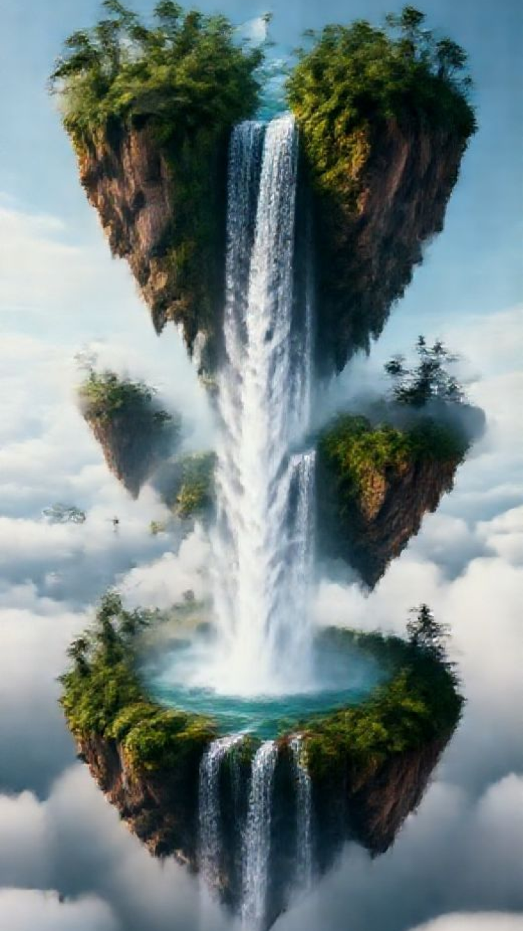 floating islands waterfalls flowing into clouds