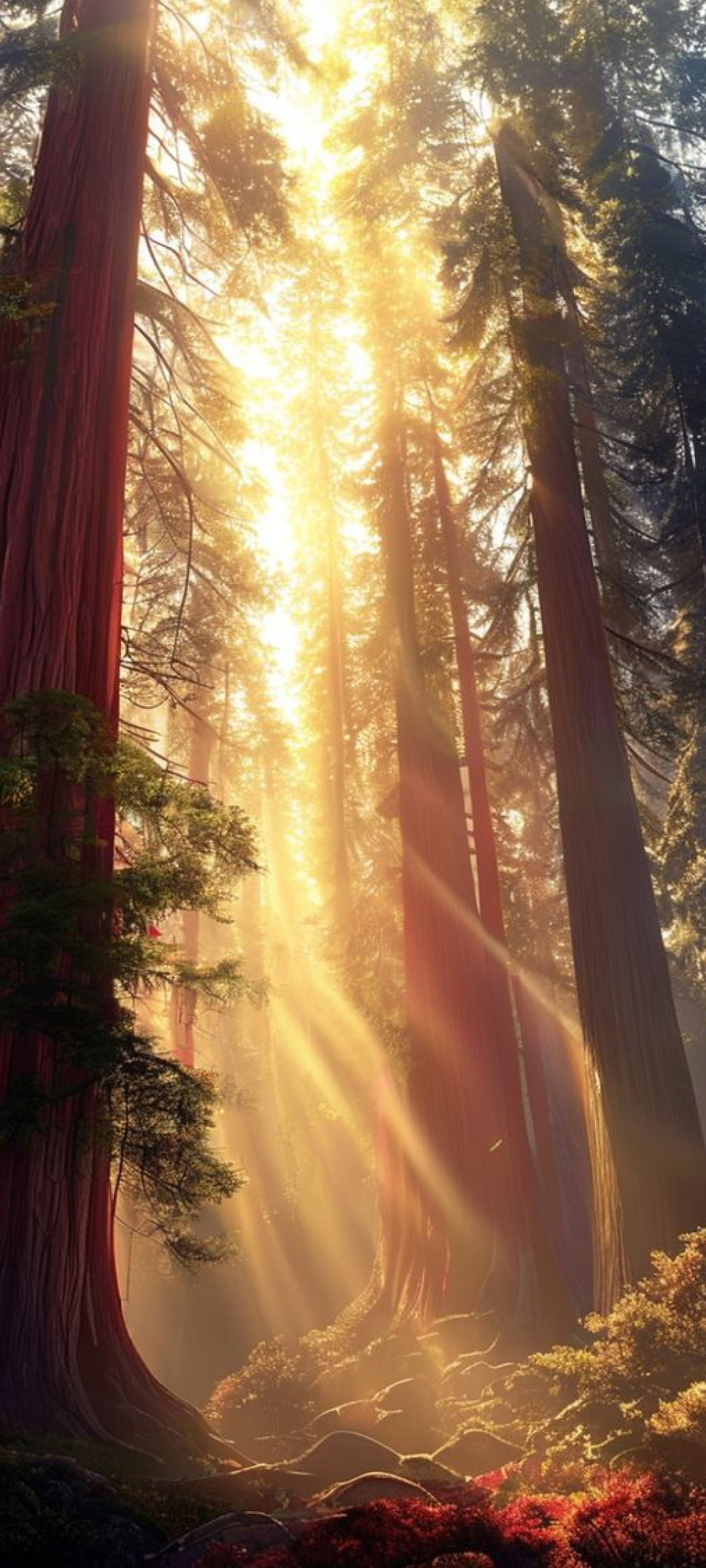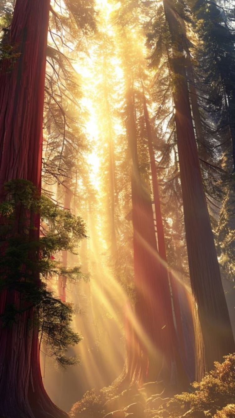 Giant Redwood Trees Morning Fog Photorealistic Wallpaper