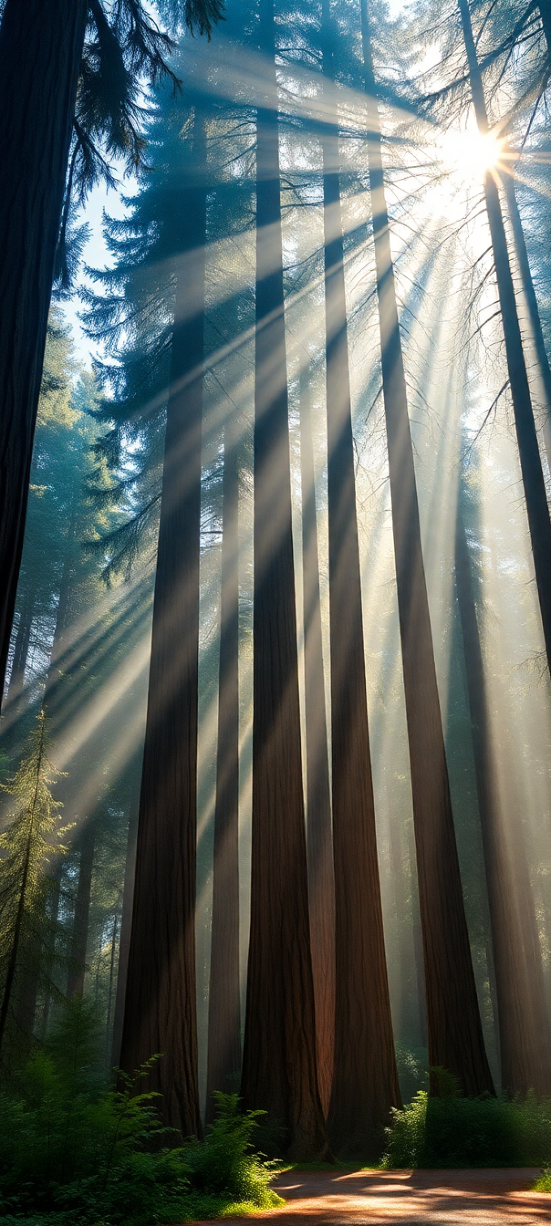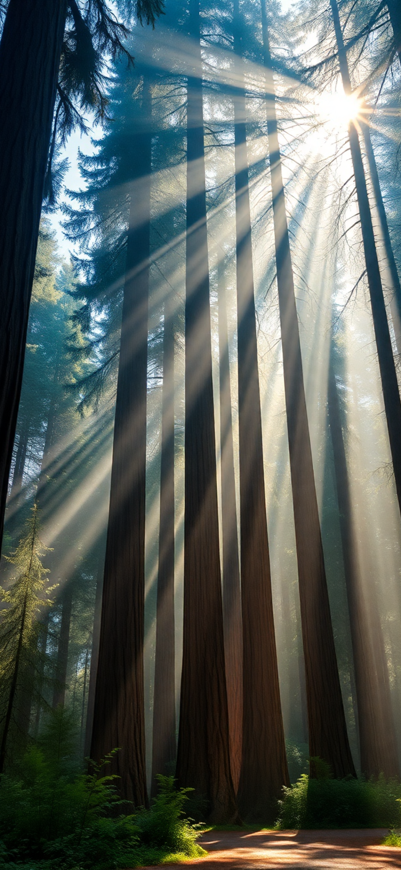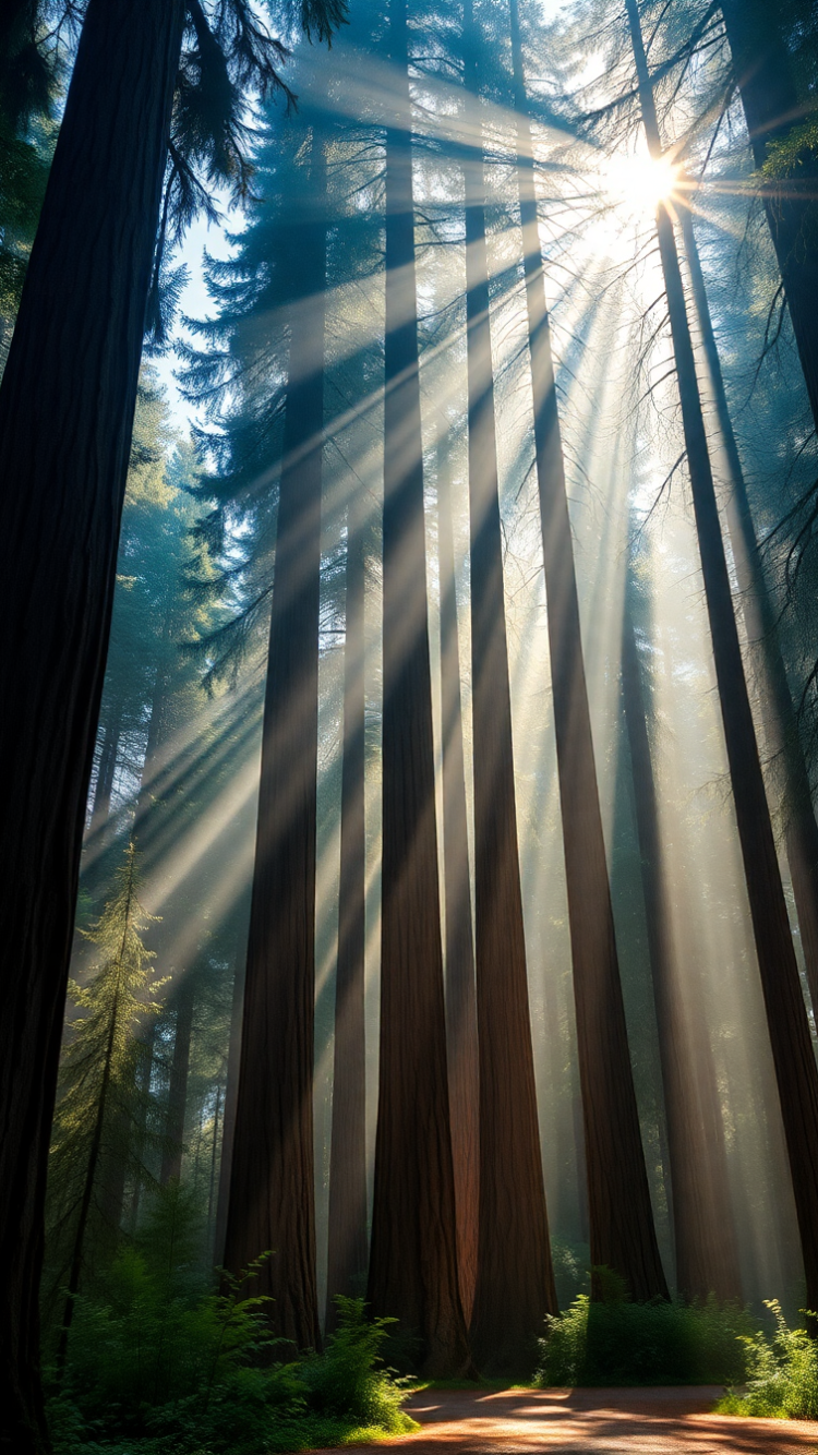 giant redwood trees morning fog sunbeams filtering through
