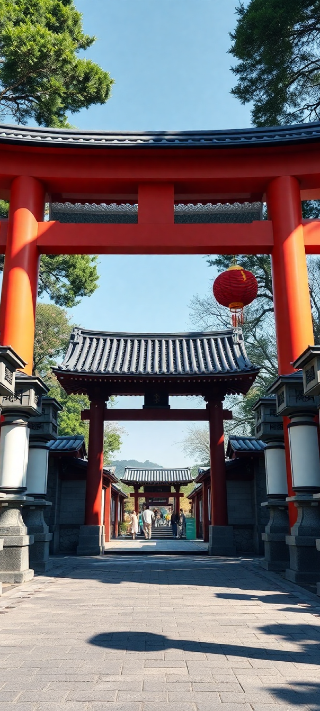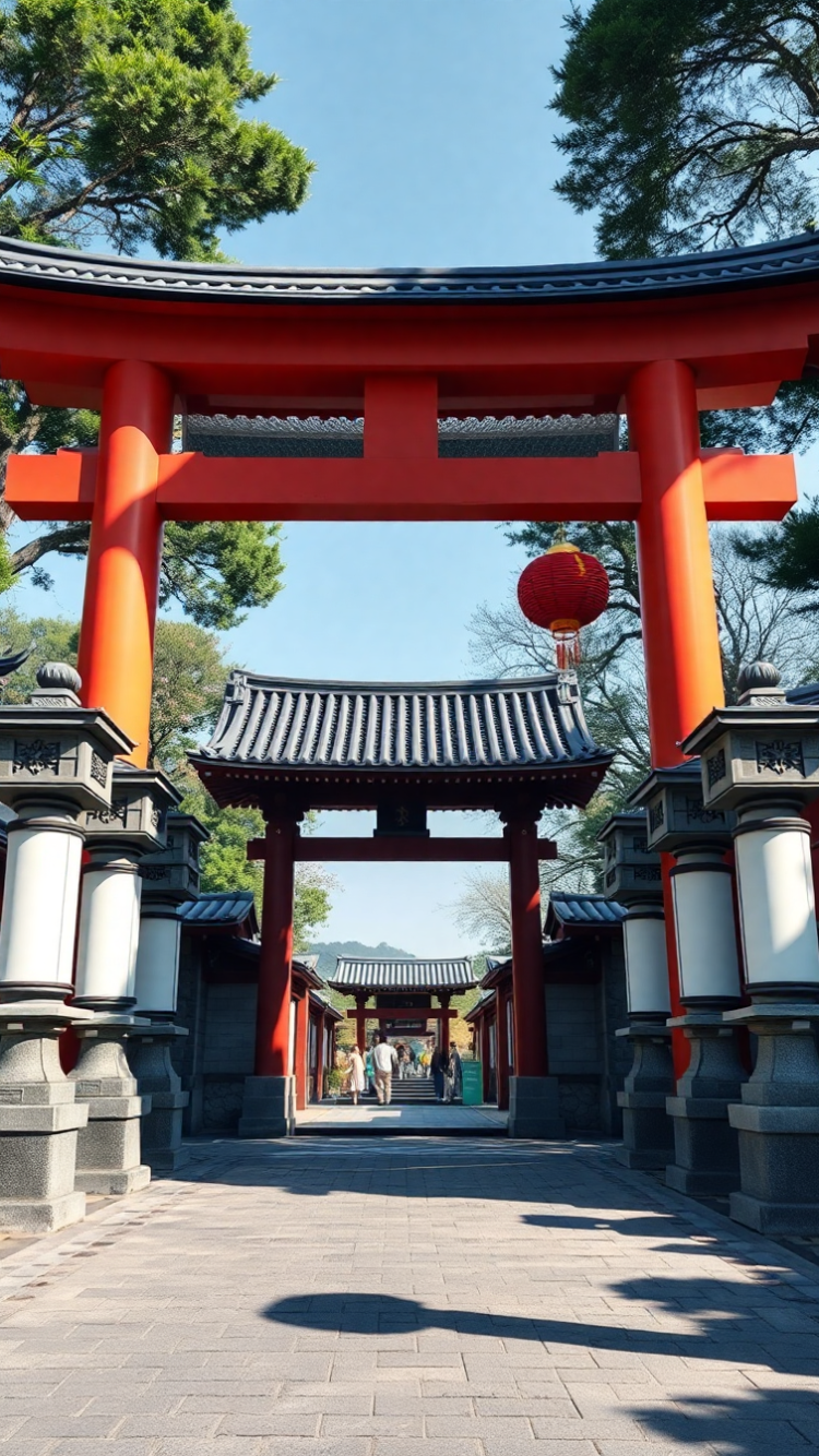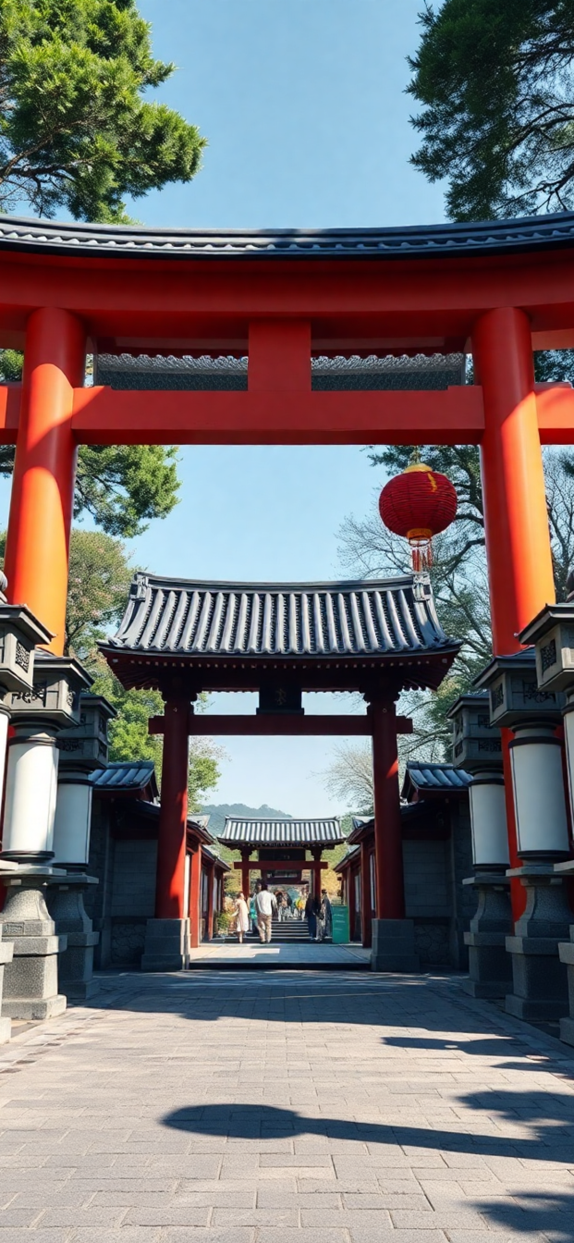 japanese temple gate torii path stone lanterns