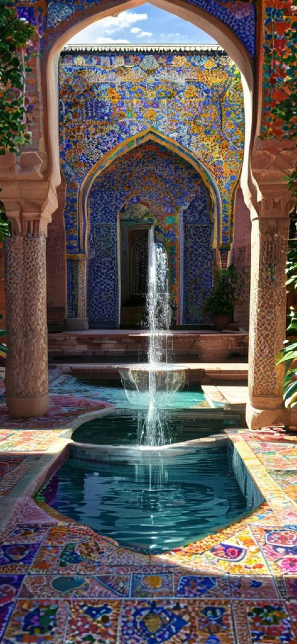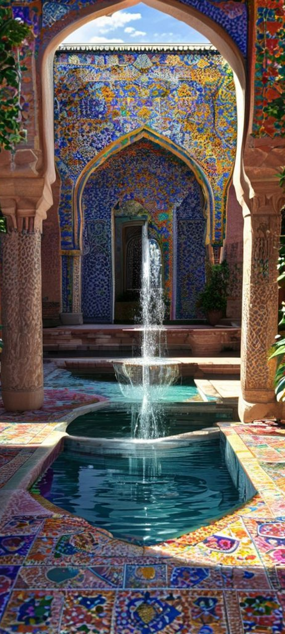 Moroccan Courtyard Tiles Fountain Mosaic Photorealistic Wallpaper