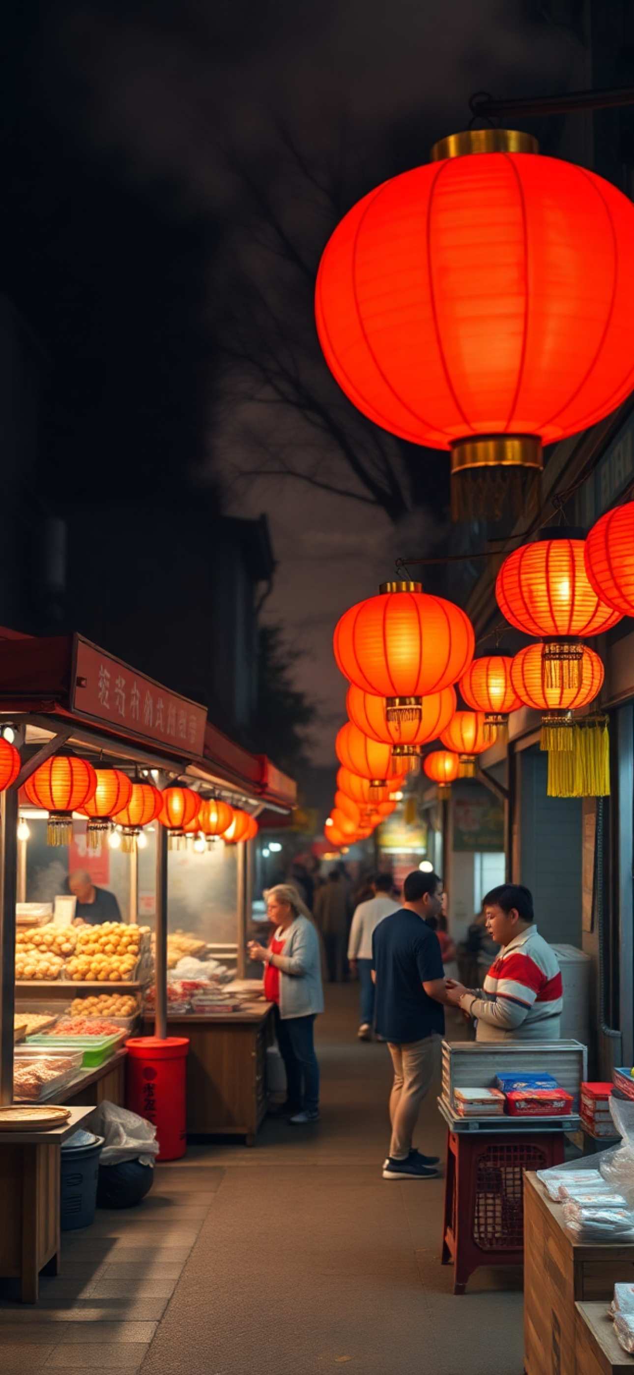 night market street food stalls steam lanterns