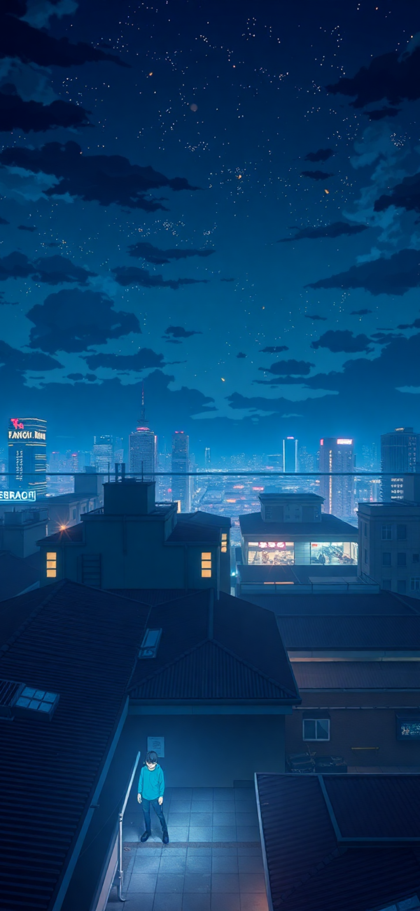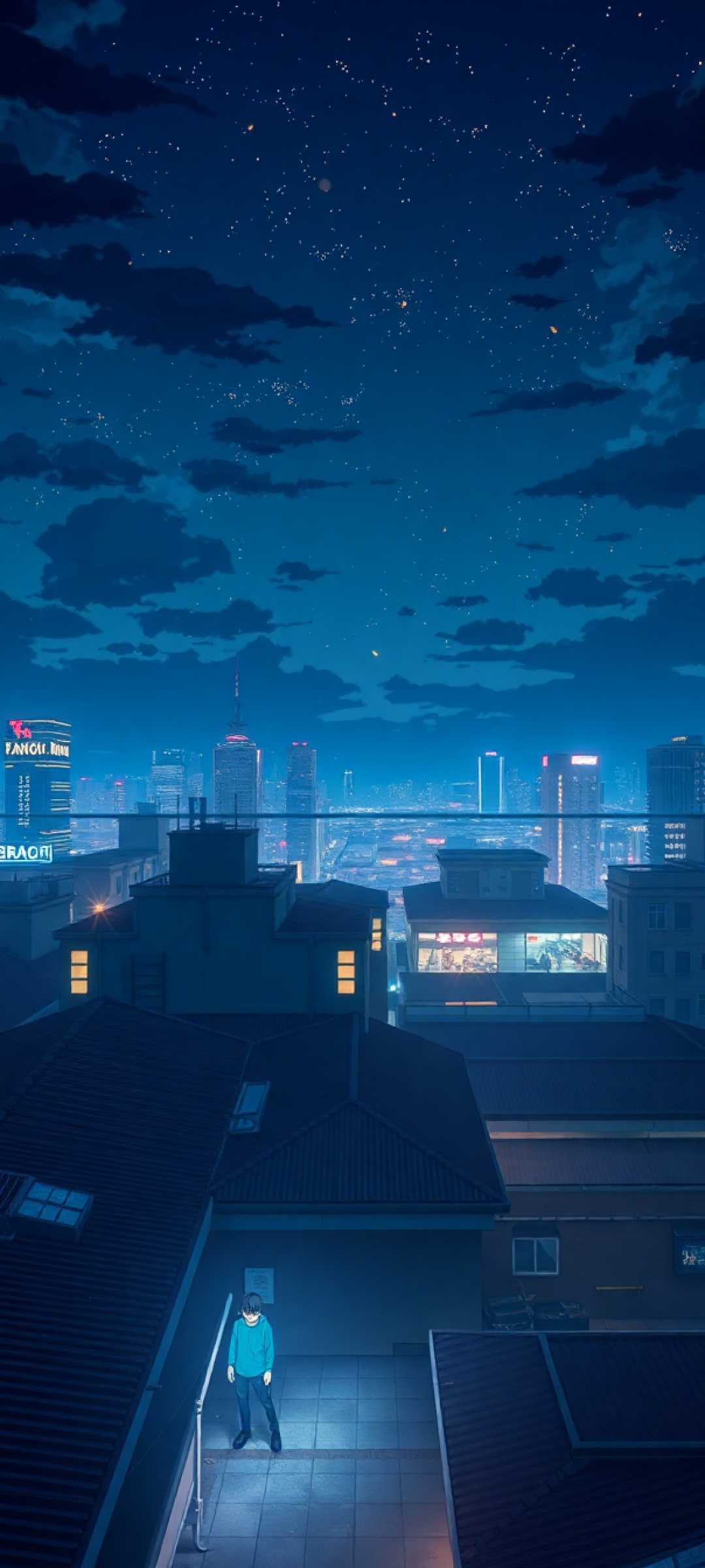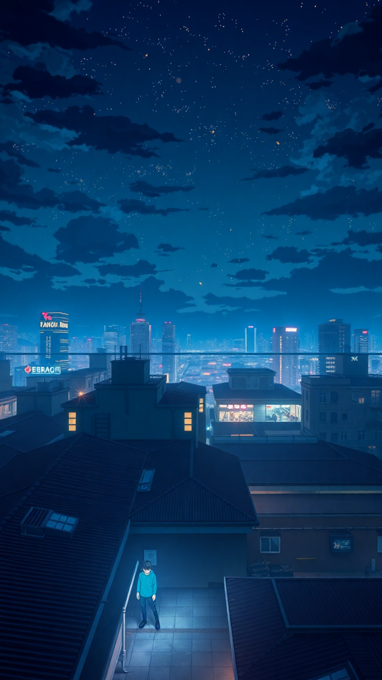 rooftop at night city lights anime aesthetic