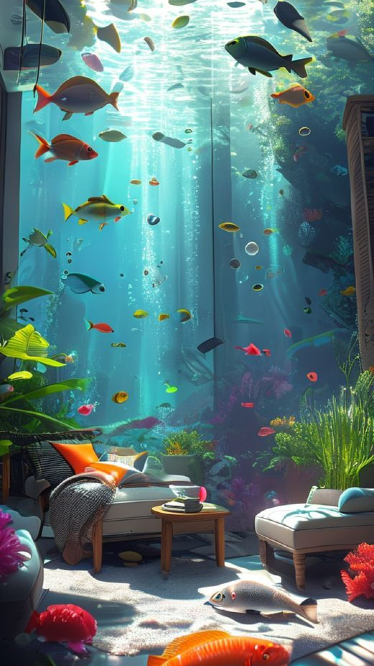 Room Underwater Furniture Floating Fish Digital art Wallpaper
