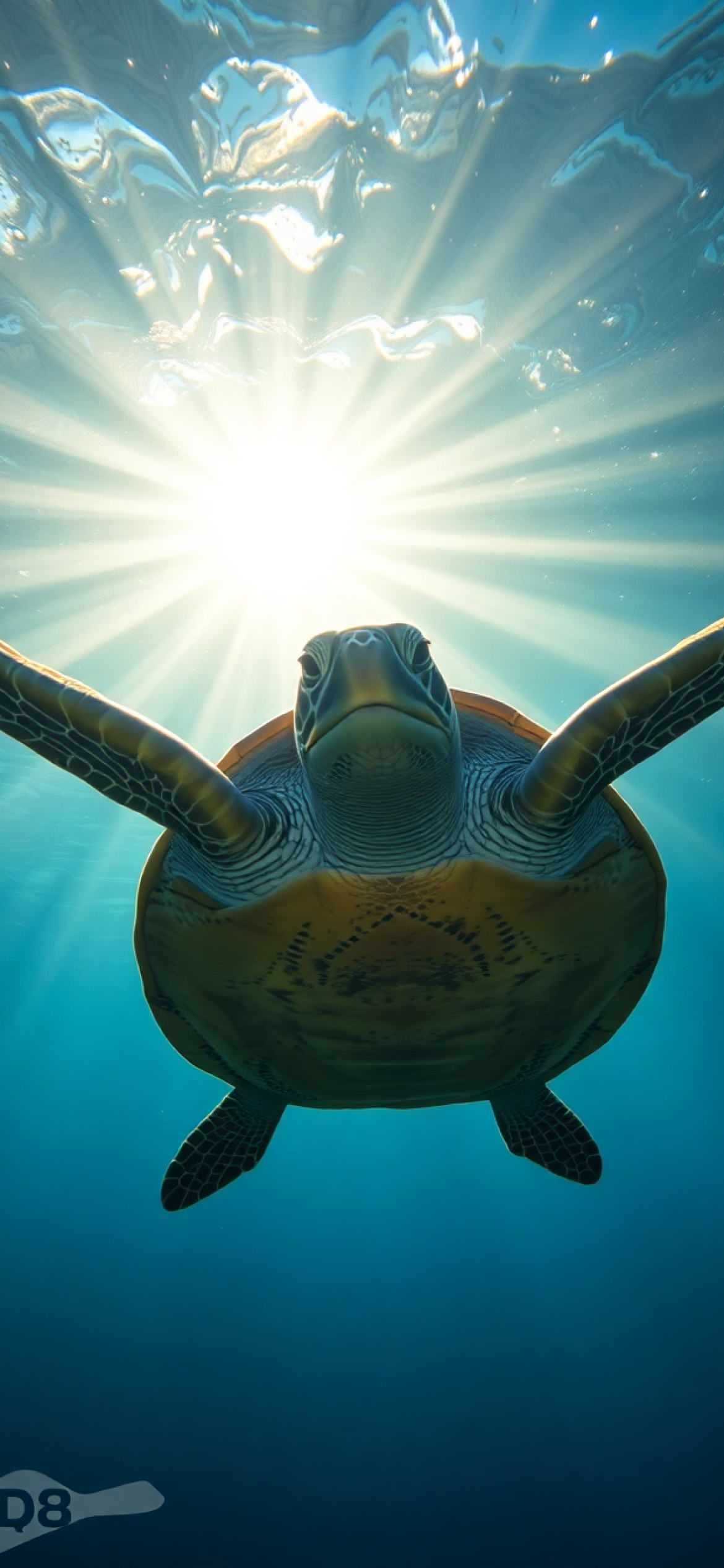 Sea Turtle Swimming Sunbeams Underwater Photorealistic Wallpaper