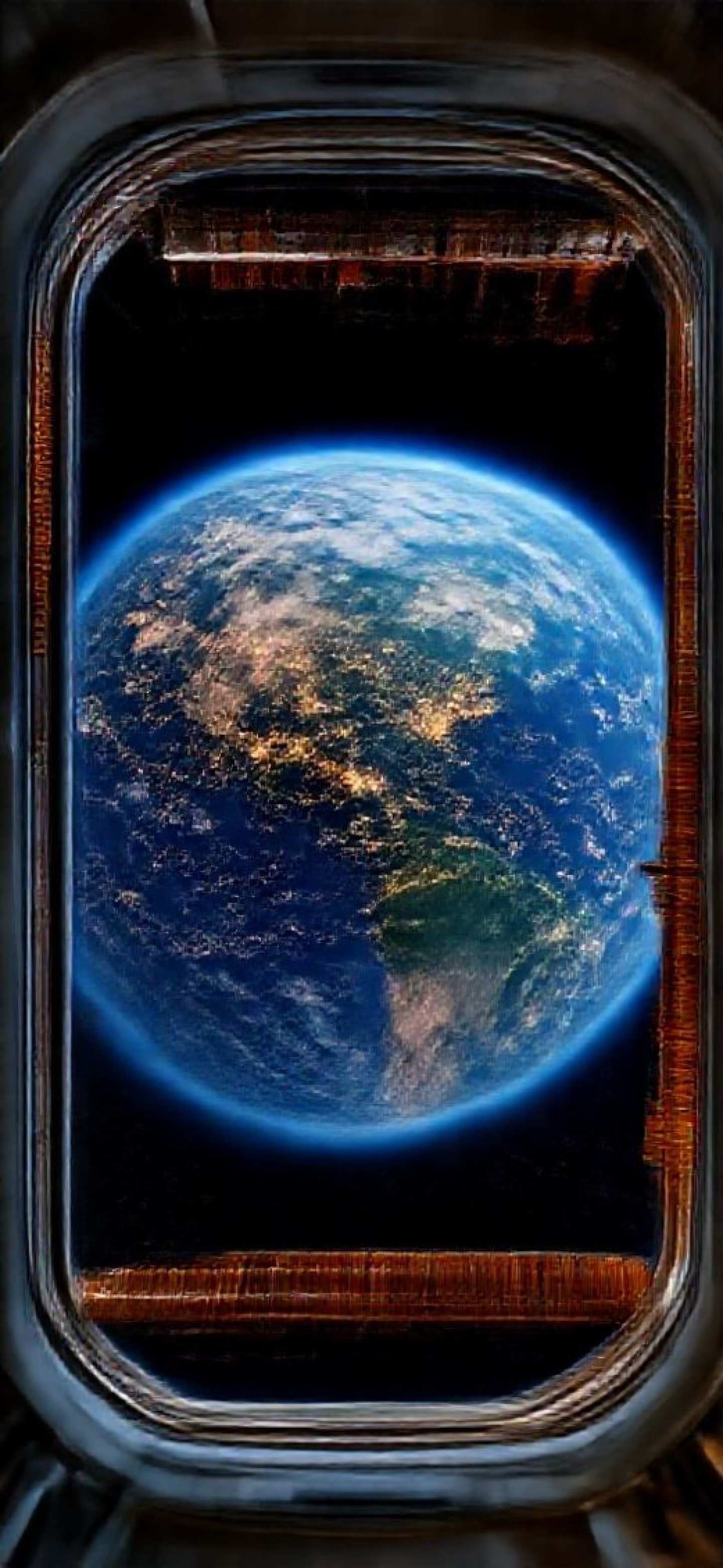 space station window view of earth at night city lights