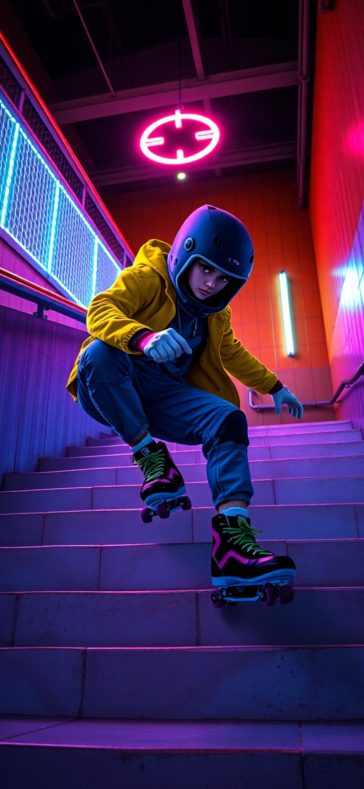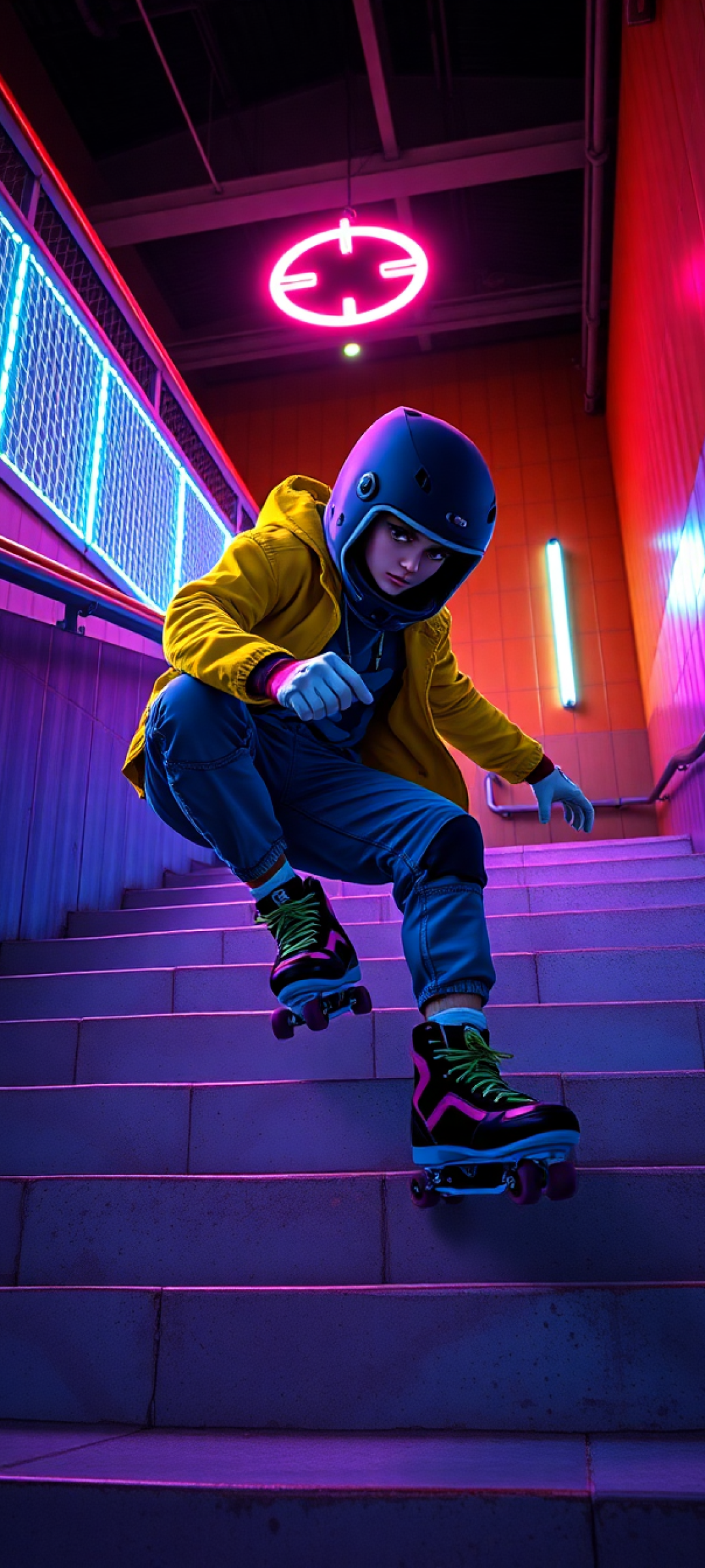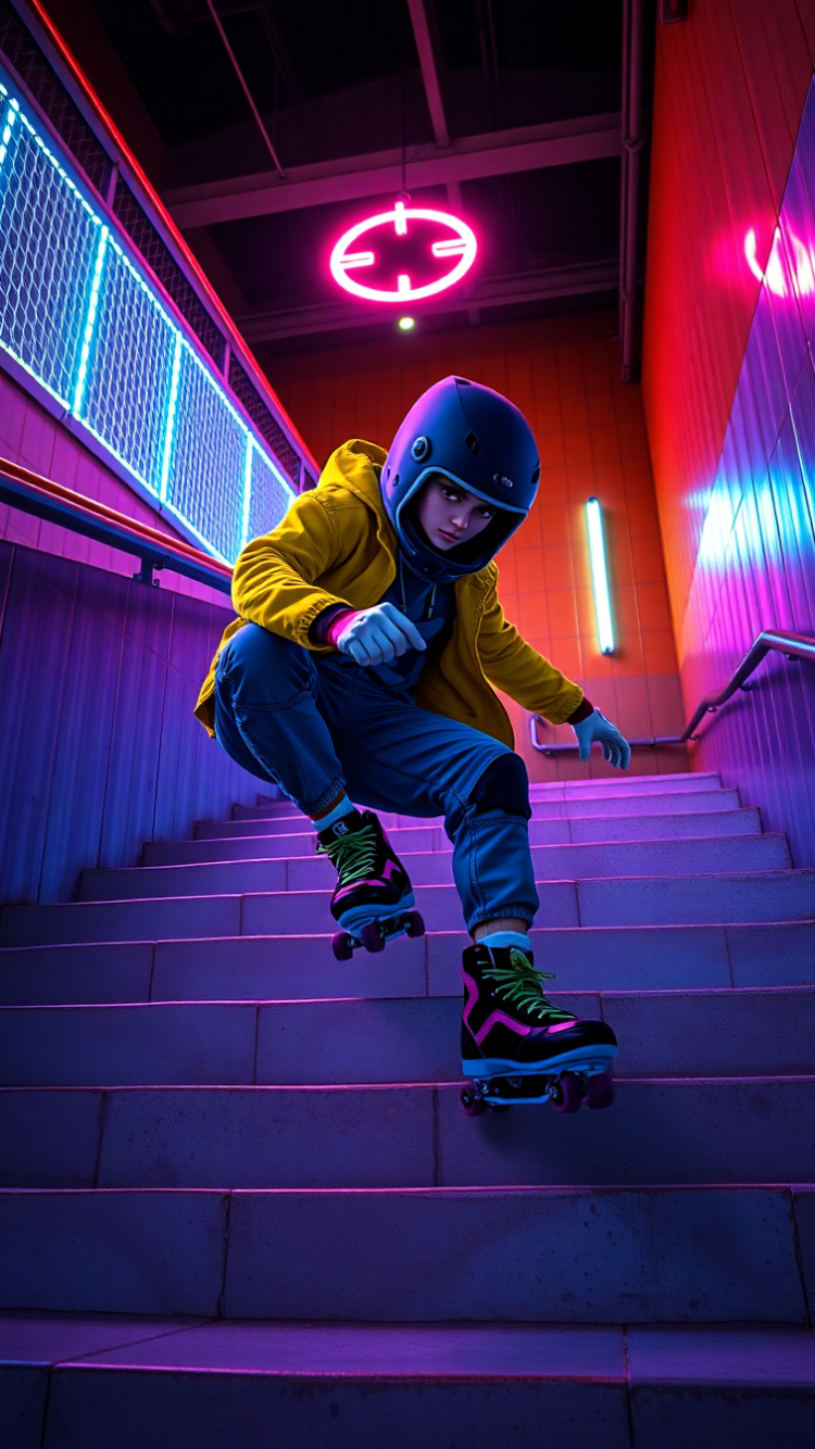 Stylish street weared rollerblader doing a soul grind in a stair rail, with neon lights and a sinthwave mood