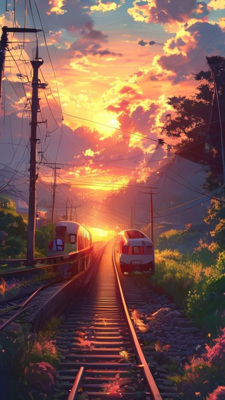 Train Crossing Rural Japan Sunset Anime Wallpaper