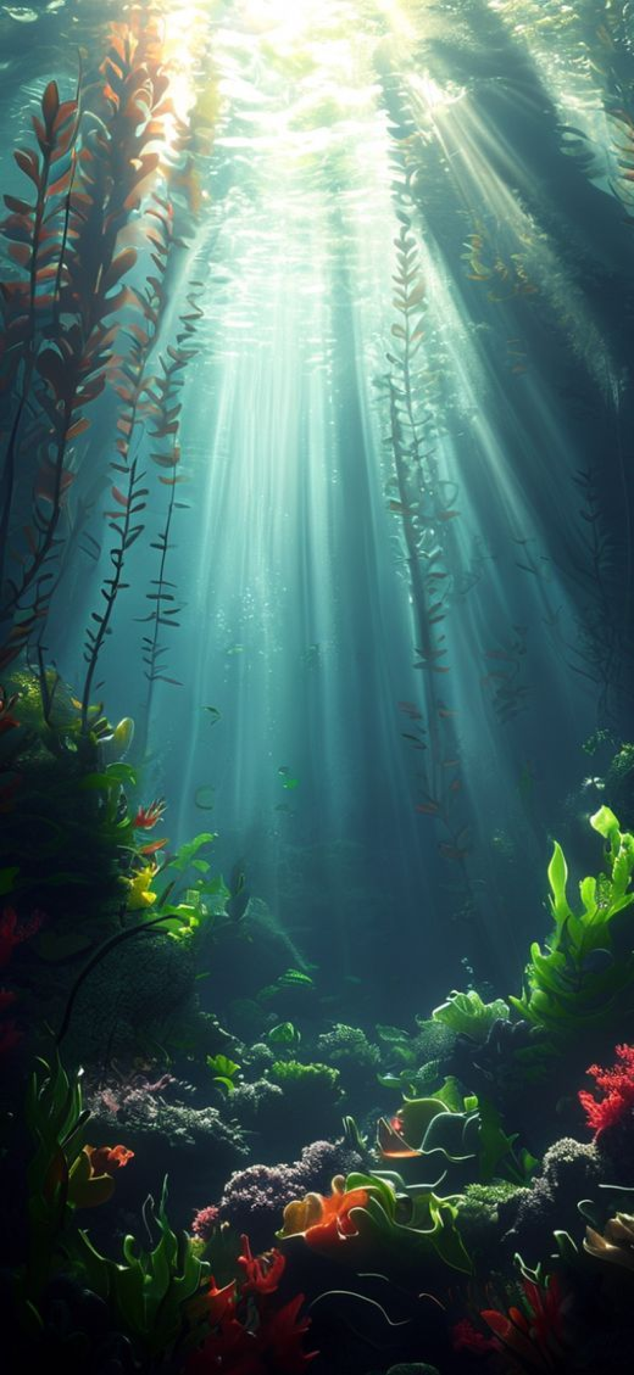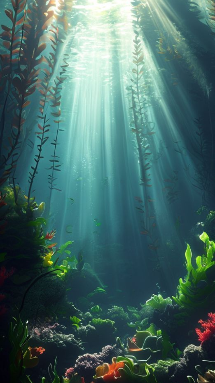 Underwater Kelp Forest Sun Rays Photorealistic Wallpaper