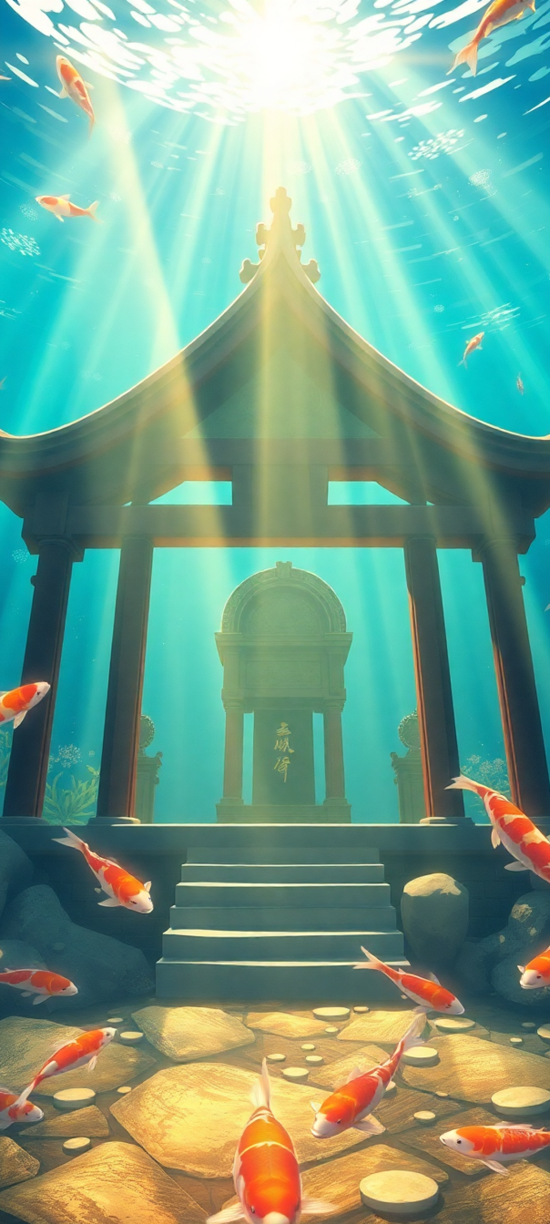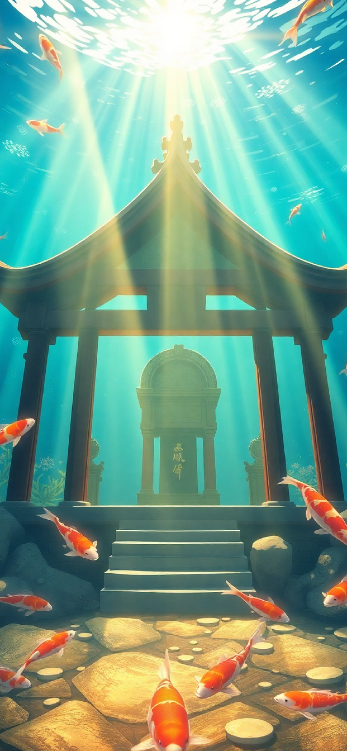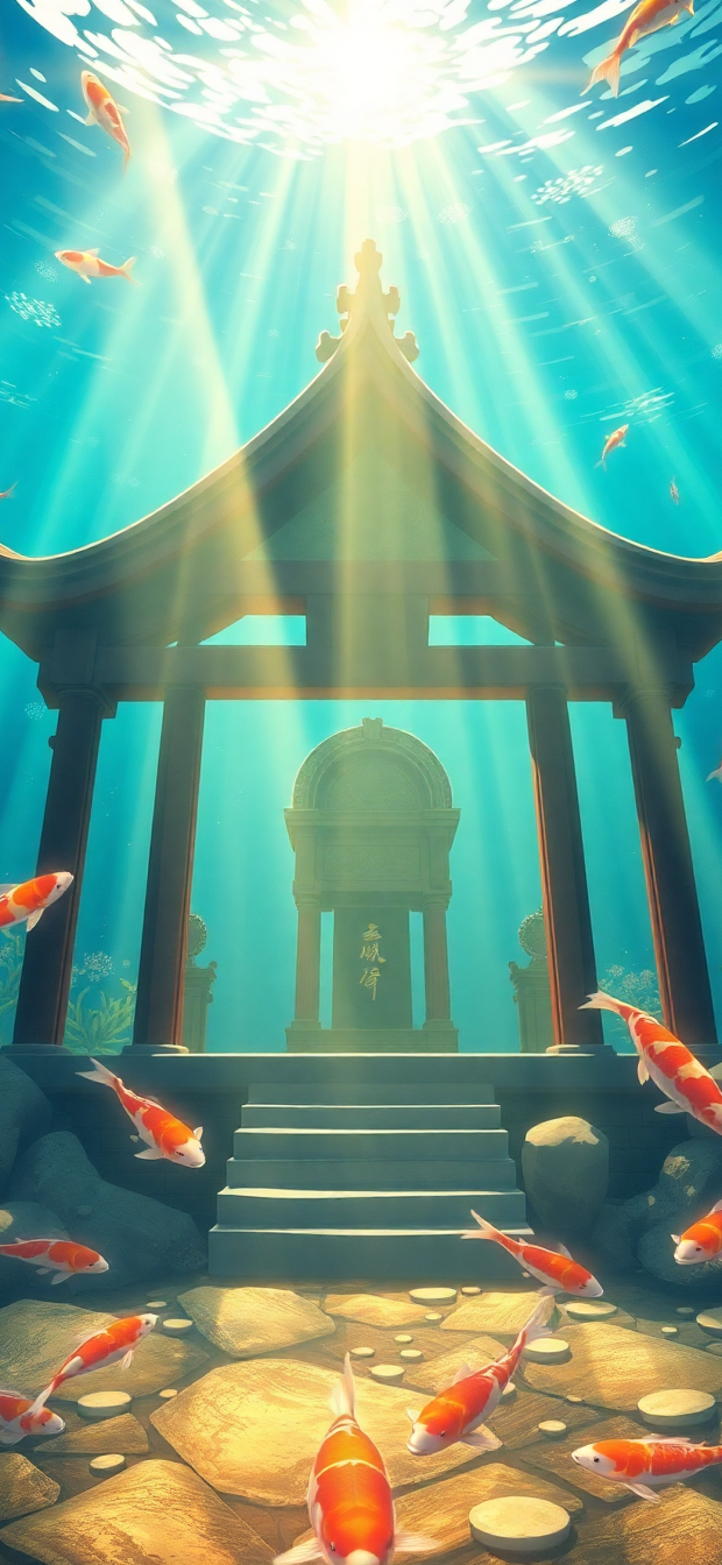 Underwater Shrine Koi Fish Swimming Anime Wallpaper