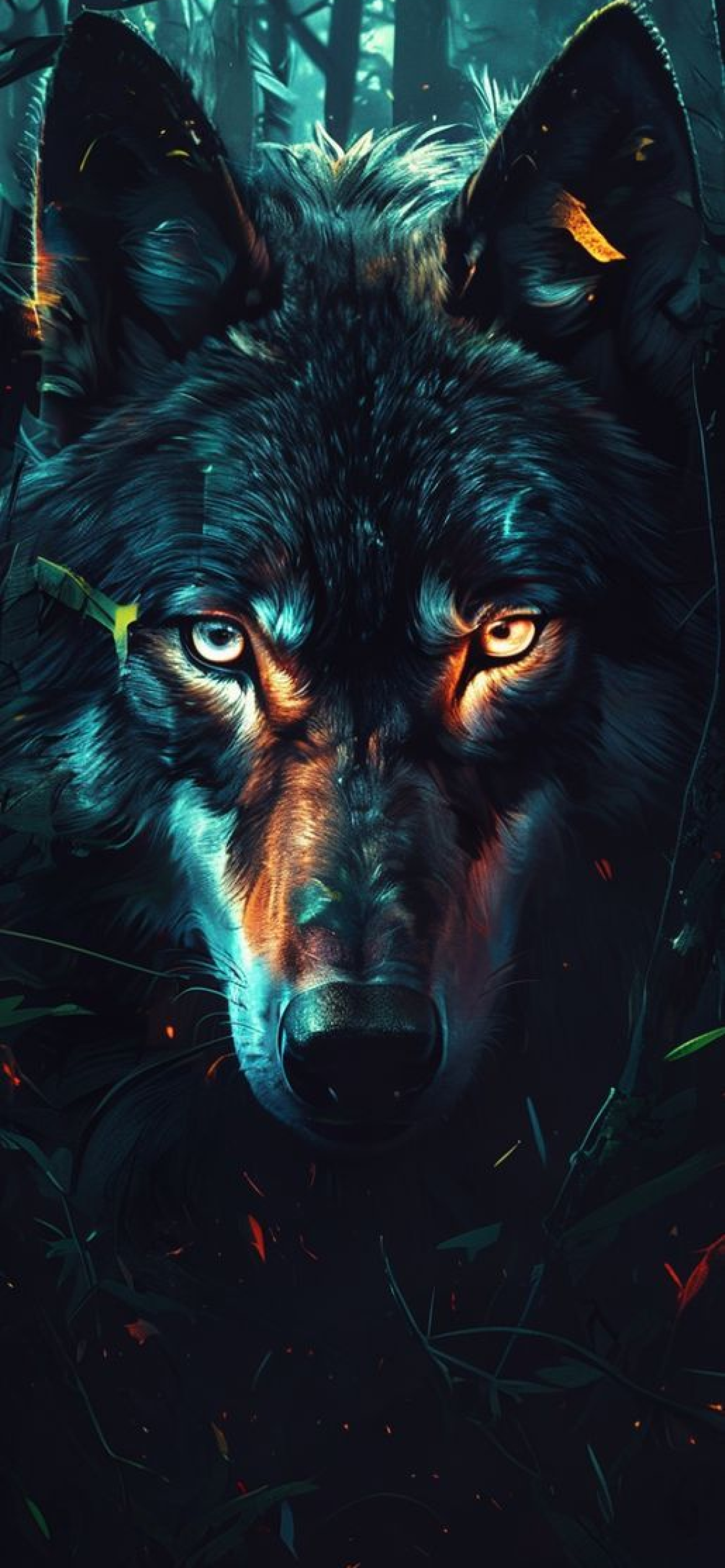 wolf eyes glowing in dark forest